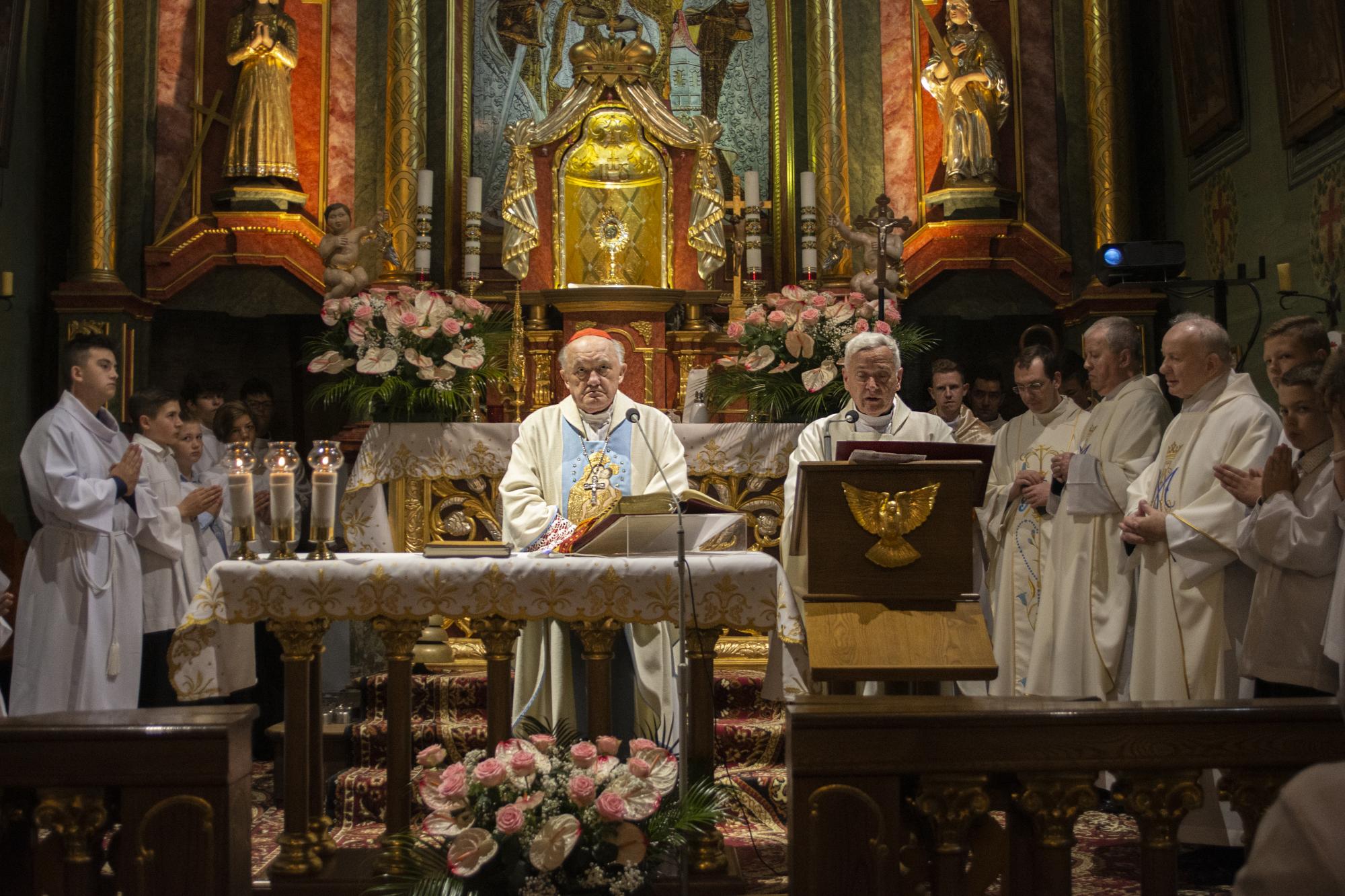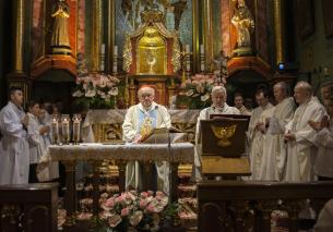 Pierwszy dzień uroczystości rozpoczął się Mszą Świętą, której przewodniczył ks. bp Roman Pindel. Koncelebrowali m.in. wikariusz generalny ks. dr Marek Studencki, dziekan ks. prałat Stanisław Morawa, diecezjalny konserwator zabytków sakralnych ks. dr Szymon Tracz i starowiejski proboszcz, którego słowa podkreśliły intencję sprawowanej Eucharystii: Dzisiaj, 21 maja A.D.2022 roku chcemy podziękować Panu Bogu za tę świątynię, za tych którzy ją budowali, za fundatorów oraz przede wszystkim za tych, którzy tworzą żywy Kościół i do tej świątyni katolickiej na tej ziemi przynosili swoje troski, kłopoty, podziękowania. Chcemy podziękować za otrzymane łaski, sprawowane liturgie i przyjmowane sakramenty święte. Po czym powitał wszystkich zgromadzonych na Mszy Św. licznych mieszkańców Starej Wsi – zaproszonych okolicznościowym, niezwykle bogatym kalendarzem roku jubileuszu - a także zaproszonych gości, wśród których byli przedstawiciele władz państwowych z podsekretarzem stanu Stanisławem Szwedem na czele oraz samorządowych, a także służb i instytucji zajmujących się ochroną i konserwacją zabytków. Już na wstępie szczególne słowa podziękowania za pomoc w organizacji uroczystości skierował pod adresem starosty bielskiego Andrzeja Płonki, obecnego wraz z członkami zarządu powiatu, a także pod adresem burmistrza Wilamowic Mariana Treli.