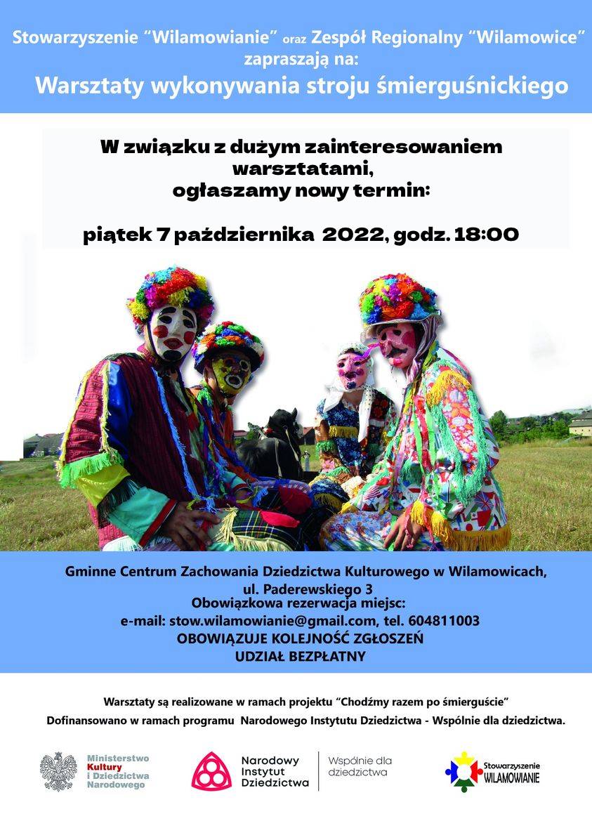 W związku z dużym zainteresowaniem zapraszamy na nowy, dodatkowy termin warsztatów, będących kontynuacją realizacji projektu "Chodźmy razem po śmierguście"przez nasze Stowarzyszenie - 7 października (piątek), god. 18:00 w Centrum Zachowania Dziedzictwa Kulturowego w Wilamowicach.