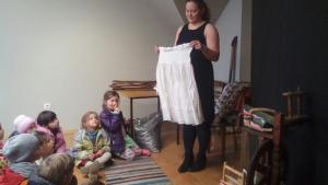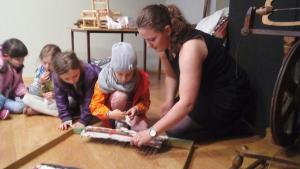 Tego dnia również po długim weekendzie wypoczęte przedszkolaki z grupy V udały się do budynku Dziedzictwa Kulturowego Miasta Wilamowice na spotkanie z panią Justyną Sznajder. Jej barwne opowieści uświadomiły dzieciom jak dawniej w Wilamowicach przebiegało życie codzienne, czym zajmowali się mieszkańcy i w jaki sposób zarabiali na swe utrzymanie. Przedszkolaki dowiedziały się z jakich roślin można było wykonać tkaniny i jak pozyskiwano z nich włókna. Poznały również prostą budowę cepów – koniecznych do wytrącenia z roślin nasion. Miały też okazję zaobserwowania pracy na kołowrotku oraz nauczenia się przeplatania kawałków tkaniny na krosnach, tworząc piękne dywaniki. Pani Justynie serdecznie dziękujemy za ciepłe przyjęcie, profesjonalny wykład i ciekawe warsztaty tkackie.