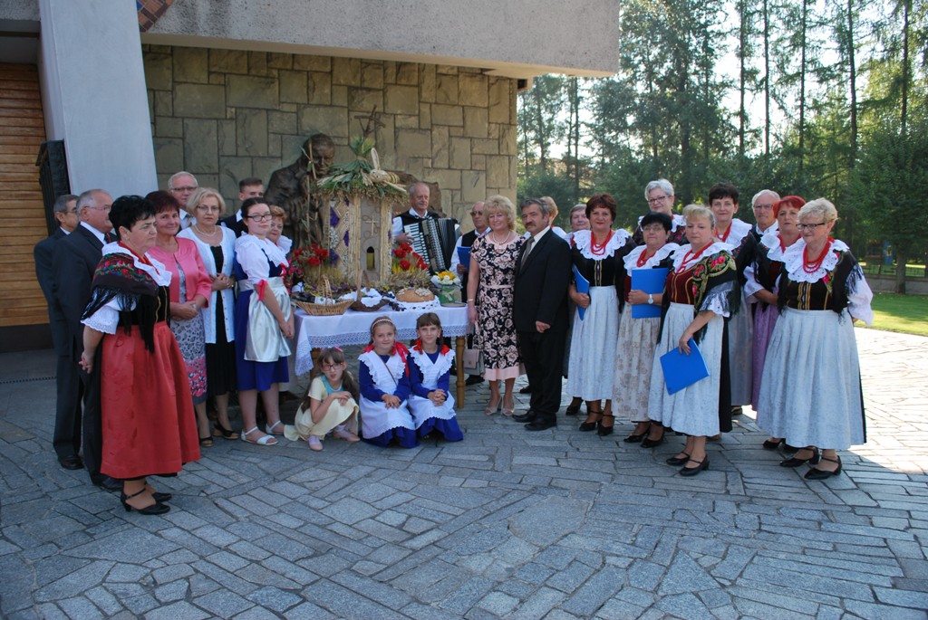 Z symbolicznym bochenkiem chleba do ołtarza szli Starostowie Dożynek-rodzina pszczelarzy państwo Agata i Adam Pieczka. Wieniec dożynkowy u stóp ołtarza złożyli państwo Urszula i Jan Handzlik wraz z paniami z Koła Gospodyń Wiejskich. Kwiaty i zboże pod zasiew niosły dziewczynki Agnieszka i Kaja. Pszczelarz pan Jerzy Smolarski, jak co roku ofiarował złocisty miód, a Sołtys wsi pan Stanisław Peszel z małżonką wino mszalne.