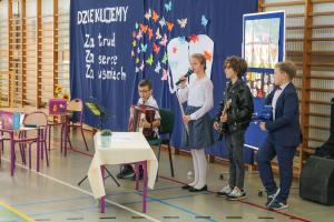 Uroczystość rozpoczęła pani dyrektor składając życzenia oraz przypominając jak ważną rolę w życiu każdego ucznia odgrywa nauczyciel. Następnie uczniowie przedstawili w humorystyczny sposób scenki z życia klasy. Na zakończenie młodzi artyści przygotowali muzyczne dedykacje dla nauczycieli prezentując krótkie popisy gry na instrumentach muzycznych.