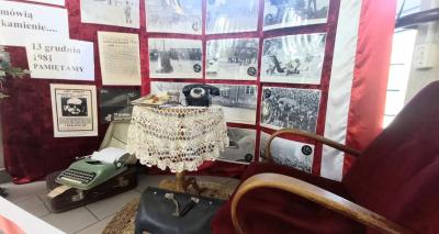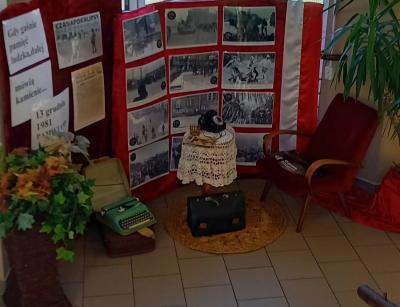 Zorganizowaliśmy również wystawę pamiątek pod tytułem 40 lat po stanie wojennym na korytarzu  szkoły zagościł kącik patriotyczno- historyczny. Oglądając wystawę możemy przenieść się do 1981 roku. Widzimy mały gabinet, jakby przed momentem opuszczony przez działacza Solidarności. Przedmioty z epoki, kartki na żywność, dokumenty i przede wszystkim zdjęcia, pomogą nam odczuć atmosferę tamtych lat.