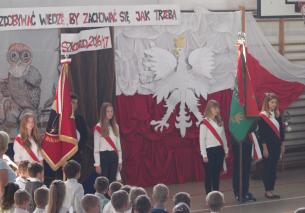 Następnie rozpoczęła się akademia w wykonaniu naszych uczniów. Przypomnieli nam oni, że 1 września to nie tylko data zakończenia wakacji, ale również rocznica wybuchu II wojny światowej oraz Międzynarodowy Dzień Kombatanta- dlatego podczas uroczystości towarzyszyły nam dwa sztandary - Zespołu Szkół oraz Kombatantów naszej gminy. Po zakończeniu oficjalnej części uroczystości uczniowie wraz z wychowawcami udali się do sal.