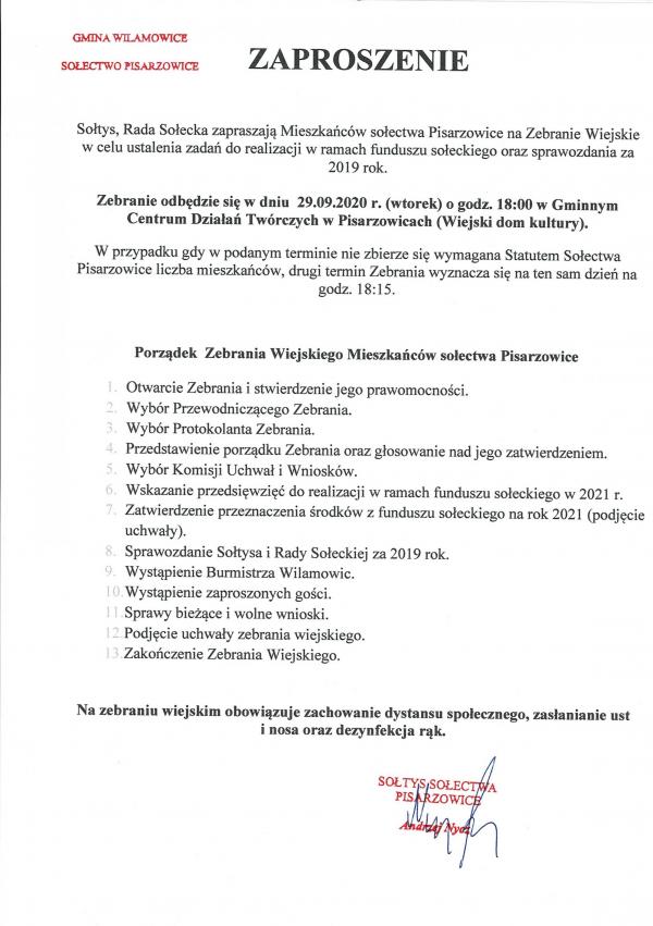 Zaproszenie na Zebranie Wiejskie w Pisarzowicach