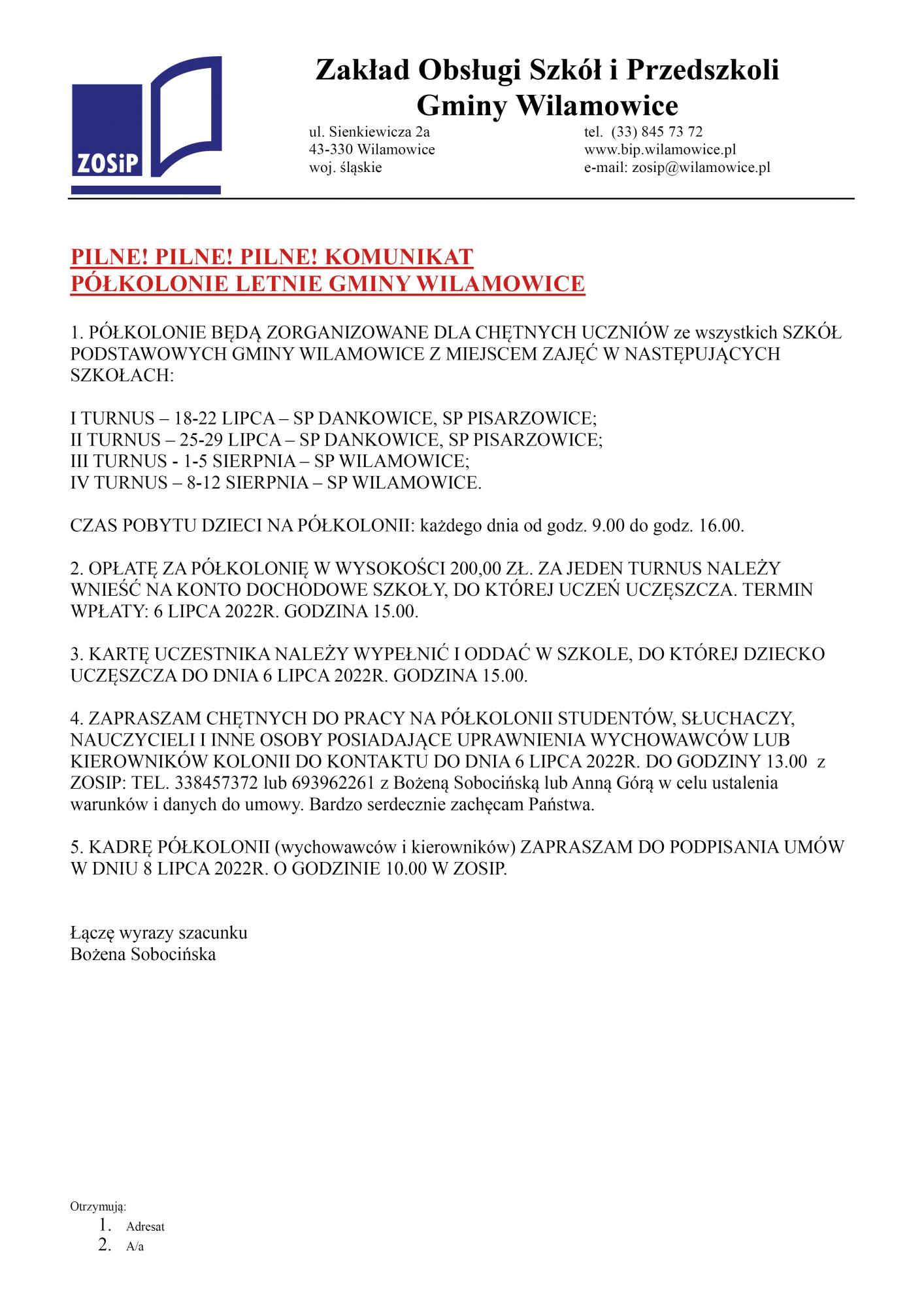 » Komunikat dotyczący półkolonii letnich w szkołach na terenie Gminy Wilamowice