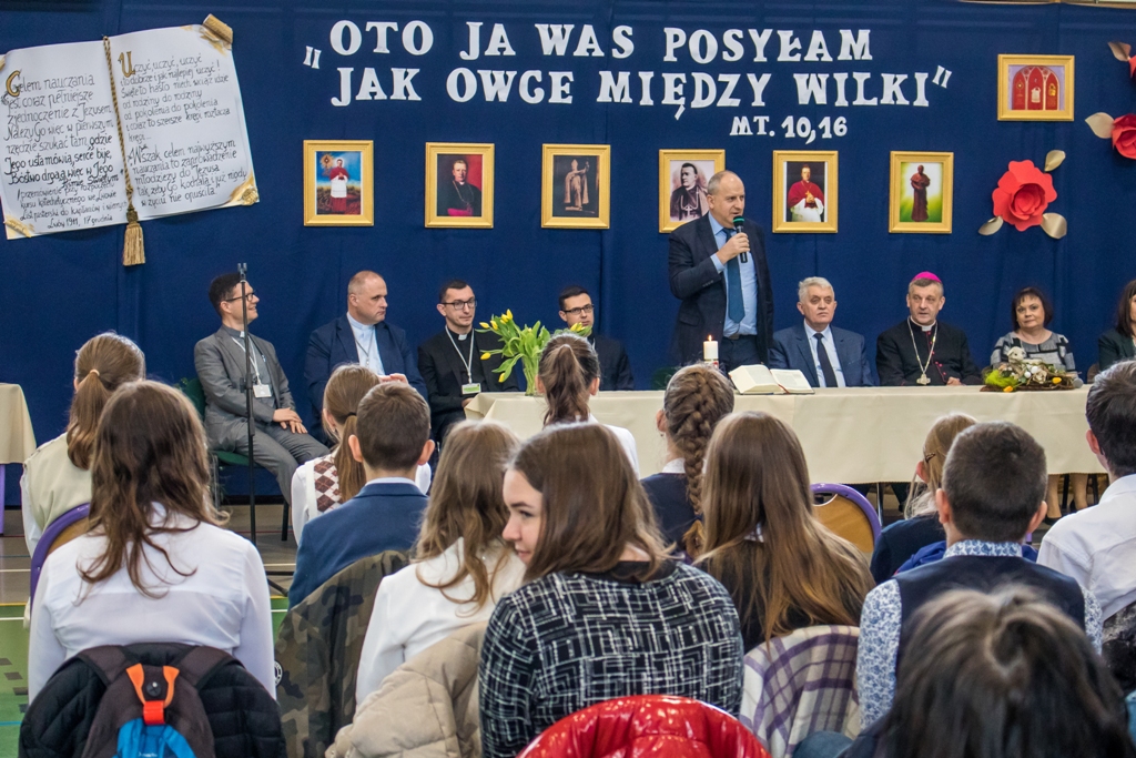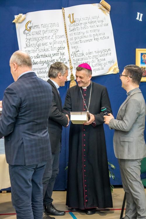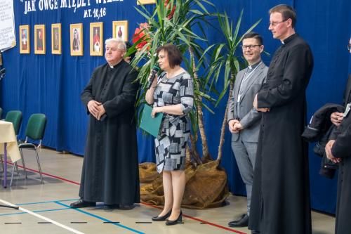 Następnie spotkaliśmy się w szkole na ogłoszeniu wyników i rozdaniu nagród. W tym wydarzeniu uczestniczyli ks. Bp Roman Pindel ordynariusz diecezji bielsko – żywieckiej, ks. Marek Studencki – dyrektor Wydziału Katechetycznego, p. Jacek Szczotka – zastępca kuratora delegatury śląskiej oraz nasz burmistrz p. Marian Trela. Pierwsze miejsce zajęła Teresa Gandor z Niepublicznej Szkoły Podstawowej z Zabrza Mikulczyce, z diecezji gliwickiej zdobywając 54 pkt. Drugie miejsce zajął Arkadiusz Jasiak z Salezjańskiego Zespołu Szkół z Zabrza Helenka, z diecezji gliwickiej uzyskując 52 pkt. Trzecie miejsce przypadło Bogdanowi Kucharskiemu z SP22 z Jaworzna. Zwycięzcom gratulujemy wspaniałych wyników, jak również wszystkim uczestnikom konkursu.