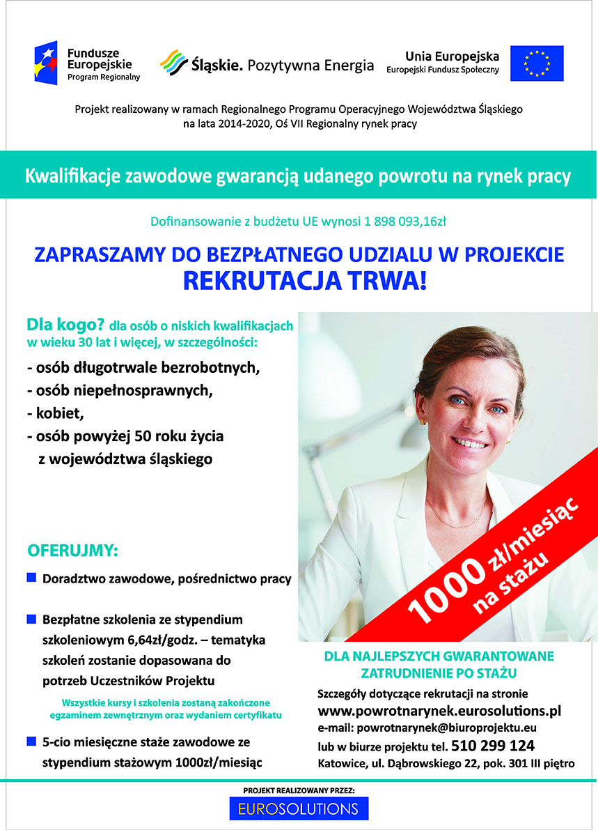 Szczegółowe informacje o projekcie oraz rekrutacji znajdują się na stronie: www.powrotnarynek.eurosolutions.pl