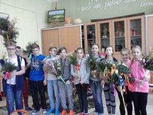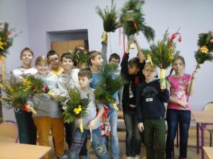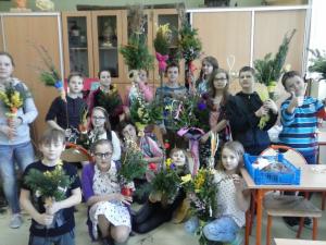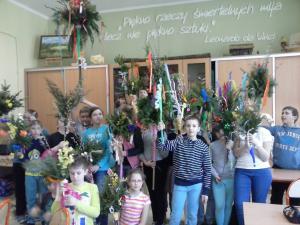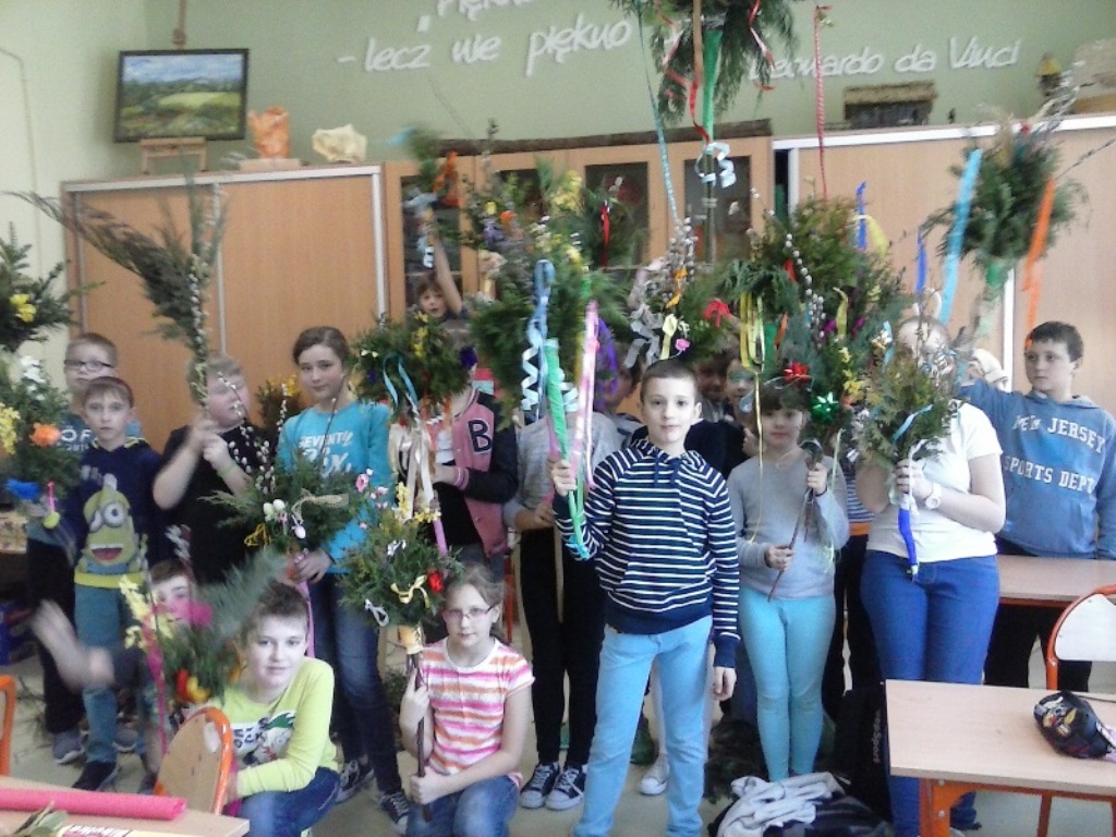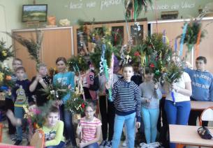 Od lat tradycją w naszej szkole jest robienie palmy wielkanocnej tuż przed niedzielą palmową. Każdy z uczniów klas IV- VI przynosi zapowiedziany wcześniej materiał na lekcję plastyki i w zależności od zebranych rzeczy wykonuje według instruktażu nauczycielki swoją niepowtarzalną pracę.