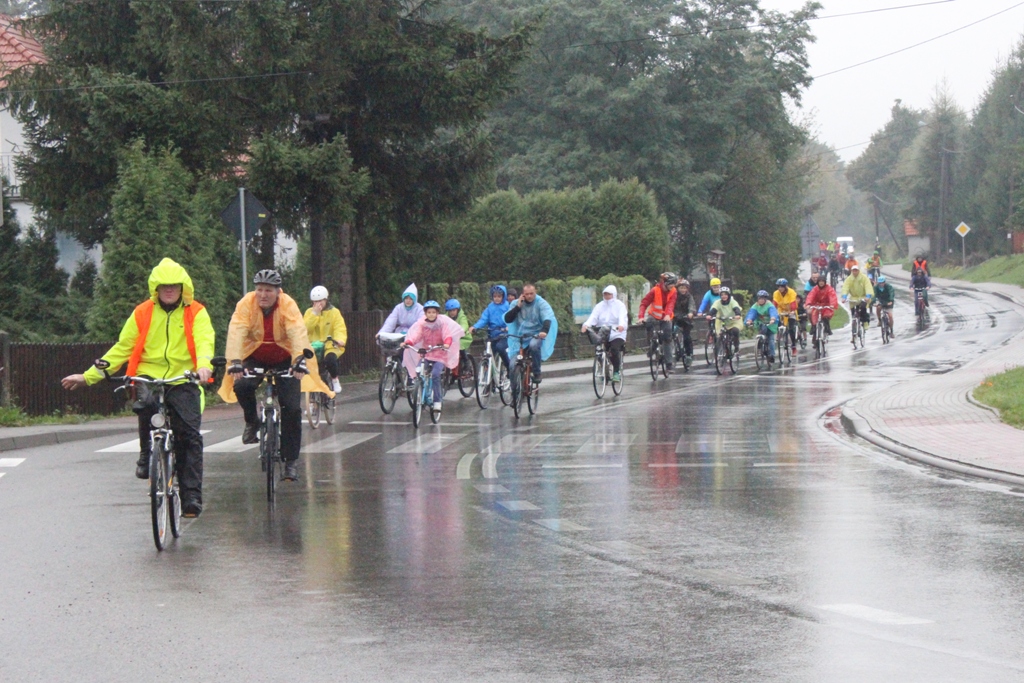 Na starcie przy boisku sportowym LKS „Wilamowiczanka” w Wilamowicach stawili się najwytrwalsi rowerzyści nie tylko w kaskach na głowie, ale przede wszystkim w pelerynach, które w tym dniu były niezbędne. Nieustający deszcz, który padał przez całą trasę rajdu utrudniał zapewne każdemu uczestnikowi jazdę, która ostatecznie została skrócona do 20 km. Swoją obecnością zaszczycił nas kolarz Przemysław Niemiec, który wraz z rodziną brał udział w rajdzie.