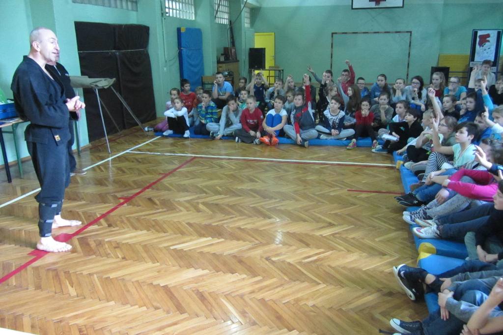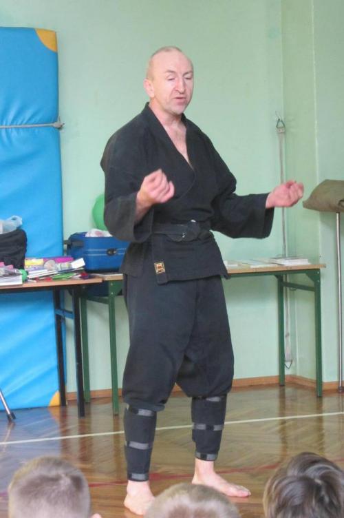 Cały spektakl przeplatany był poradami, co należy robić, co jeść, aby być zdrowym. Jak trzeba się zachowywać i żyć żeby być w ciągłej zgodzie ze sobą i całym światem. Mistrz Jurij, który demonstrował nam swoje możliwości, pokazał między innymi siłę koncentracji oplatając wokół swojej szyi dwu metrowy, stalowy pręt. Umiejętność walki z bólem chodząc po szkle, utrzymując na sobie prawie 1000 kilogramów, czy też wchodząc po długich mieczach niczym po schodach. Całość wywarła na naszych uczniach ogromne wrażenie. Dzieci nagrodziły naszego gościa gromkimi brawami i ustawiły się w kolejce, aby zdobyć autograf.