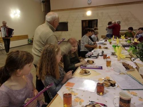 Pani Basia upiekła ciasto „Usta Adama”, a pani Czesia „Jabłkowy Rarytas”. Ciasta jak na tę uroczystość były nie tylko pyszne, ale i trafne z nazwy. Panowie wręczyli każdej Pani „dużej czy małej” po dużej - kalorycznej czekoladzie, natomiast najmłodsze członkinie zespołu Kaja, Wiktoria i Zuzia wręczyły panom słodkie belgijskie łakocie. Po tych pysznościach można było pomyśleć o „odkładaniu sadełka”. Ale nic z tych rzeczy. Zadbała o to w 100% nasza choreograf Bogusia, szlifując i nie dając wytchnienia członkiniom podczas próby nad nowym programem. Program ten będzie zaprezentowany na „Wiosennym spotkaniu kobiet 2018-Rok Praw Kobiet w Polsce”. Spotkanie to organizuje Zarząd Koła Gospodyń Wiejskich dla wszystkich swoich członkiń jak i zaproszonych gości w kawiarni Fest Park 10 kwietnia br.