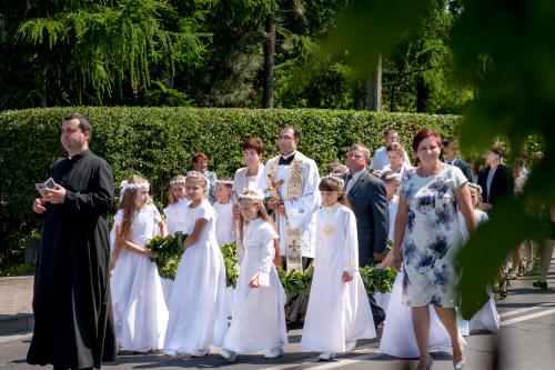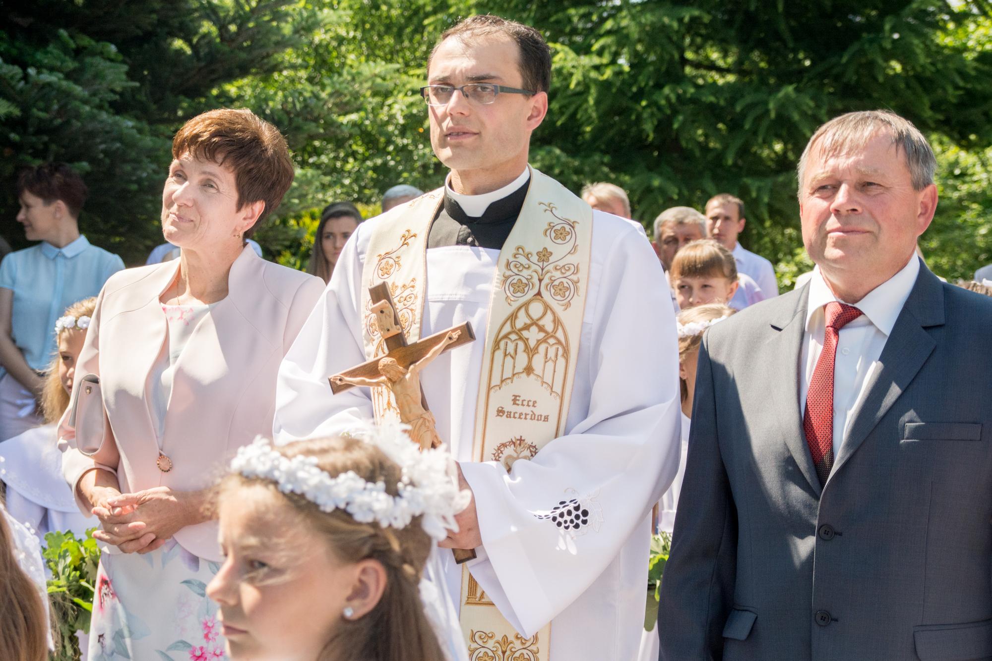 Prymicjant otoczony dziewczynkami w sukienkach komunijnych