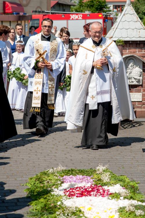 Uroczysta Eucharystia poprzedzona była wyjątkowym przemarszem, w którym mieszkańcy Hecznarowic oraz zaproszeni goście odprowadzili ks. Grzegorza z domu rodzinnego do kościoła parafialnego. Parafianie, by podkreślić doniosłość chwili i radość całej wspólnoty, udekorowali drogę młodego księdza. Po specjalnym błogosławieństwie udzielonym przez rodziców towarzyszący prymicjantowi uroczysty orszak wyruszył do świątyni. W procesji asystowali mu ksiądz wikariusz Wojciech Maćkowski i rodak ksiądz Bartłomiej Pająk oraz rodzina i przyjaciele. Nie zabrakło pocztów sztandarowych szkoły, górników, OSP Hecznarowice i wysyłających sygnały świetlne samochodów straży pożarnej, której ksiądz Grzegorz jest członkiem. Rytm pochodu wyznaczała Młodzieżowa Orkiestra Dęta. Sam prymicjant ubrany w szaty liturgiczne podążał otoczony dużym wieńcem, który niosły dziewczynki w białych komunijnych sukienkach. Kiedy procesja zmierzała do świątyni, słychać było dzwony witające przybywający na uroczystość orszak. Przed kościołem nowo wyświęconego księdza powitał proboszcz parafii ksiądz Aleksander Smarduch, trzymając w ręku przepiękny relikwiarz będący darem prymicjanta. Darem szczególnie cennym, bo kryjącym relikwie patrona hecznarowskiej świątyni św. Urbana – papieża i męczennika, których dotychczas parafia nie posiadała.