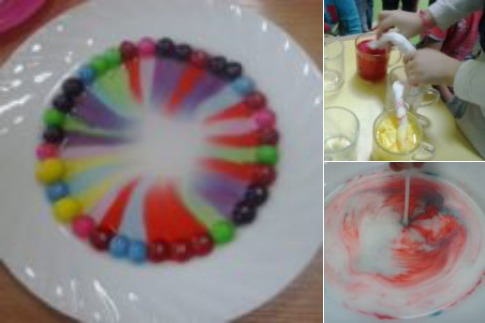 Dzieci układały kolorowe cukierki na talerzykach. Następnie na środek talerza nalewaliśmy wodę i po chwili smugi kolorów układały się w barwną tęczę.