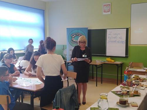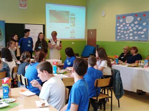 Mieliśmy przyjemność powitać delegatów i opiekunów z sąsiednich szkól. Dzieci miały okazję zapoznać się ze sposobami zachowań w różnych miejscach i sytuacjach. Po części teoretycznej i wysłuchaniu krótkiej historii Savoir-vivr’u, uczniowie wykonali między innymi prawidłowe nakrycie do stołu. Brali też udział w wylosowanych przez siebie scenkach aktorskich. Były one przeciwieństwem dobrych manier, dzięki czemu skłaniały wszystkich do cennych komentarzy i uwag, - co należałoby zmienić w danej sytuacji, aby być kulturalnym człowiekiem.