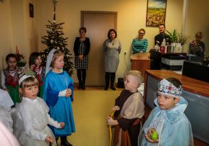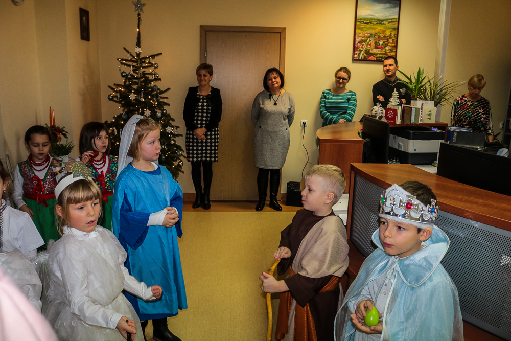 W repertuarze muzycznym znalazły się utwory takie jak: Piosenka pani Zimy, Taniec góralski, Malusieńki Jezus, Dziś w Betlejem, Ciemno, cicho , jak również kolęda Lulajże Jezuniu.  Oprócz życzeń  skierowanych  do panów Burmistrzów oraz pracowników Urzędu Gminy wręczyliśmy świąteczne upominki, które przygotowały dzieci wspólnie z rodzicami w czasie warsztatów plastycznych. Nasz trud włożony w przedstawienie został doceniony przez Sekretarza Gminy pana Andrzeja Kołtuna, który gorąco podziękował za bogatą i wymowną treść życzeń.