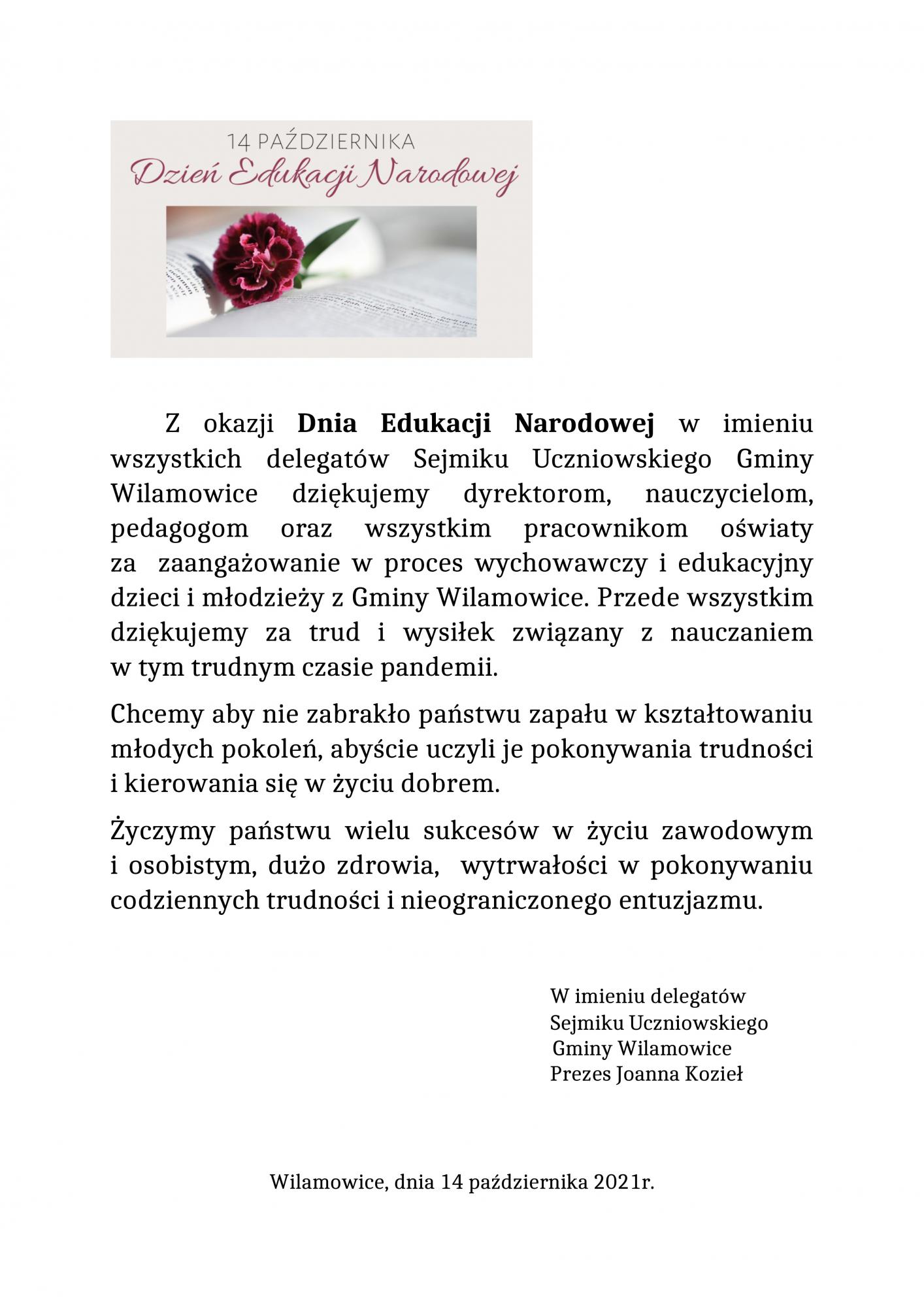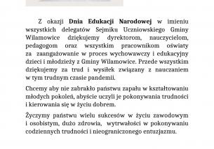 Podziękowania od delegatów Sejmiku Uczniowskiego Gminy Wilamowice z okazji Dnia Edukacji Narodowej
