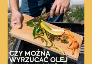 Czy zużyty olej można wyrzucać do kompostownika? NIE ! Wylanie takiego odpadu do kompostownika powoduje zanieczyszczenie gleby, uśmierca małe żyjątka, a nawet może zanieczyścić wody gruntowe. Zużyty olej jadalny należy zgromadzić w plastikowej butelce, szczelnie zamknąć i wyrzucić do czarno-pomarańczowego pojemnika lub zawieźć do najbliższego Punktu Selektywnej Zbiórki Odpadów (PSZOK).