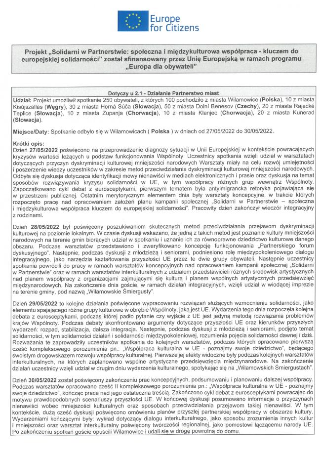Wszystkie zadania projektowe odbyły się w Wilamowicach w dniach 27-30 maja 2022 r. i skupiły 250 obywateli miast partnerskich z Kisújszállás (Węgry), Hornej Súčy, Kuneradu i Rajeckich Teplic (Słowacja), Dolníego Benesova (Czechy), Klanjca i Županji (Chorwacja) oraz Wilamowic. Podczas czterech dni spotkań uczestnicy projektu wzięli udział w warsztatach, dyskusjach i wykładach poświęconych współpracy międzynarodowej opartej na zasadzie solidarności, łączącej wszystkie kraje Unii Europejskiej. Projekt promował postawy solidarności oraz poszanowania praw człowieka zwłaszcza wobec uchodźców poszukujących ochrony w Polsce, poprzez kształtowanie pozytywnego wizerunku innych kultur oraz wspieranie dialogu i spotkań międzykulturowych z ludźmi z różnych środowisk i kultur. Podczas działań projektu omawiano pozytywne wartości jakie niesie obecność w UE i co dzięki niej osiągnęliśmy. Podkreślaliśmy w szczególności olbrzymi postęp cywilizacyjny, który udało się dzięki UE osiągnąć w różnych aspektach życia społecznego i kulturalnego. Dzięki działaniom projektowym pokazaliśmy, że poprzez współpracę i wytrwałe konsultacje można osiągnąć porozumienie w każdej kwestii. W projekcie zwracaliśmy uwagę na potrzebę solidarnego działania w każdej ważnej sprawie dotyczącej narodów UE, co było jednym z elementów kampanii społecznej „Solidarni w Partnerstwie - społeczna i międzykulturowa współpraca kluczem do europejskiej solidarności”. Poprzez debaty i dyskusje staraliśmy się na własnych przykładach i doświadczeniach, przekazać większą wiedzę o osiągnięciach UE.