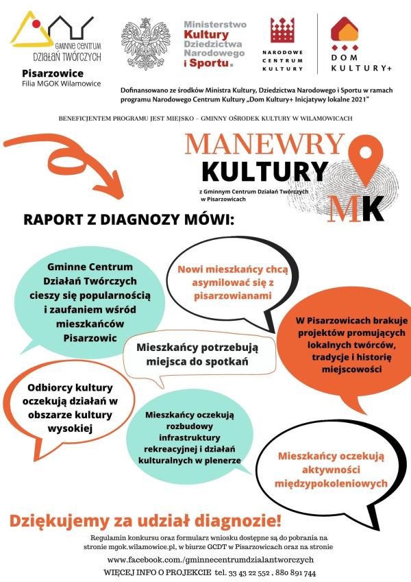 10 czerwca br. w Gminnym Centrum Działań Twórczych w Pisarzowicach (filia M-GOK Wilamowice) miało miejsce spotkanie dotyczące przedstawienia raportu z diagnozy prowadzonej w ramach projektu "Manewry Kultury", omówienie założeń konkursu na inicjatywy kulturalne oraz warsztaty dla osób zainteresowanych konkursem. Wnioski zawarte w Raporcie można znaleźć w linku poniżej. Zapraszamy do lektury!