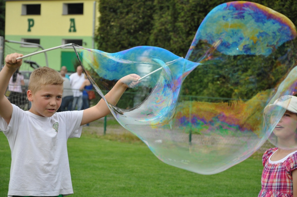 Olbrzymie bańki mydlane unosiły się w górę podtrzymując rodzinną, serdeczną, atmosferę i pękały roześmiane nad Naszymi głowami. Do dmuchanego domku i zamku ustawiały się kolejki Dzieciaków pełnych energii, a w świetnie wyposażonym bufecie każdy mógł znaleźć to, na co miał ochotę -począwszy od wspomnianej wcześniej waty cukrowej, przez gofry, prażone, kiełbaski, ciasta i napoje.
