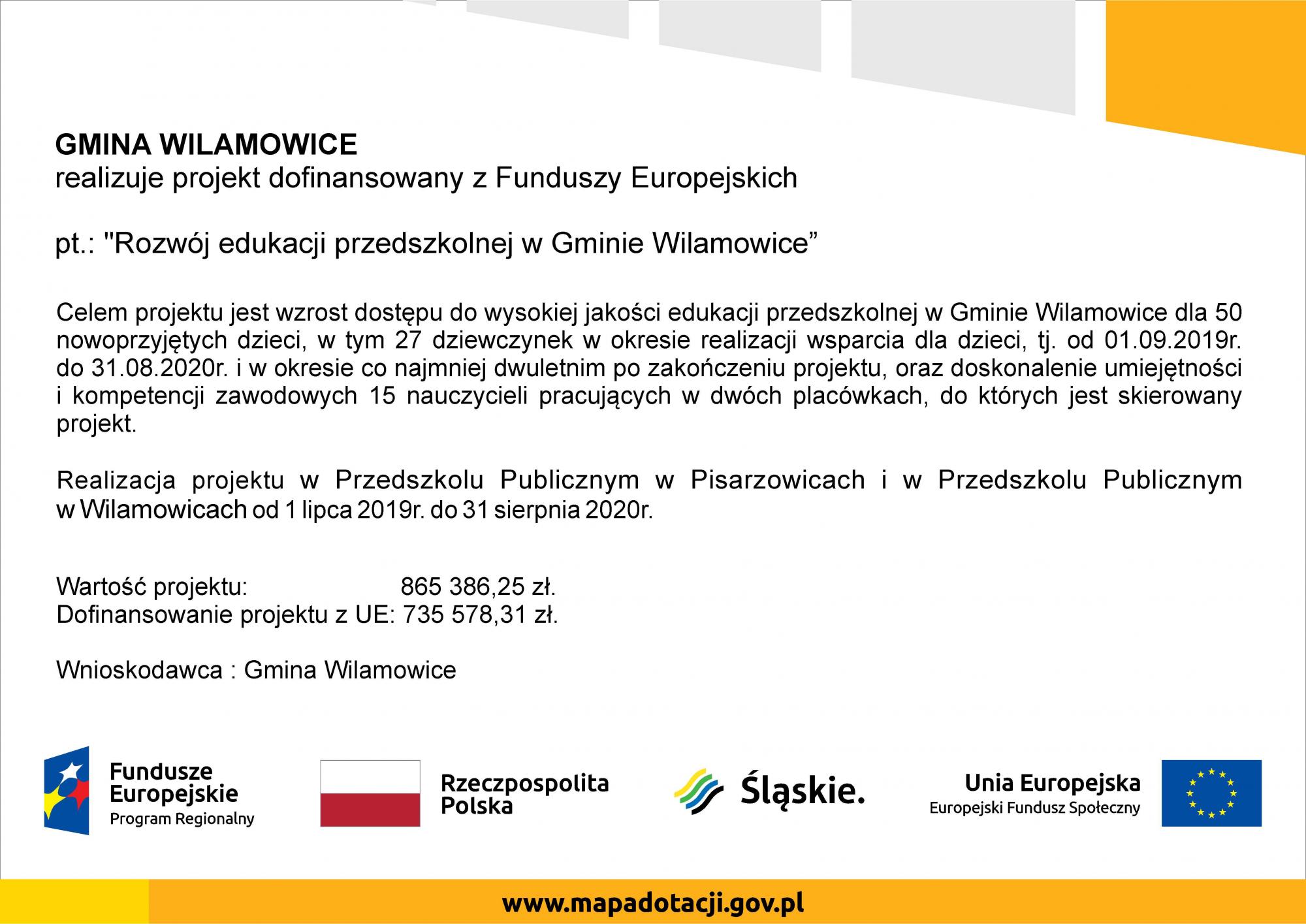 W dniu 15 stycznia 2020r. podpisana została umowa o dofinansowanie projektu pt.: ,,ROZWÓJ EDUKACJI PRZEDSZKOLNEJ W GMINIE WILAMOWICE” w ramach Regionalnego Programu Operacyjnego Województwa Śląskiego na lata 2014-2020 współfinansowanego ze środków Europejskiego Funduszu Społecznego nr UDA-RPSL.11.01.03-24-0286-19-00 pomiędzy Województwem Śląskim a Gminą Wilamowice.