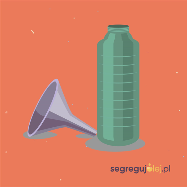 Wlej cały olej do butelki PET o dowolnym rozmiarze. Może to być butelka po mleku lub wodzie mineralnej. Ważne, aby butelka była całkowicie pełna i szczelnie zamknięta. W żadnym wypadku nie wlewaj oleju bezpośrednio z butelek do pojemnika.