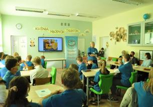 W nawiązaniu do społeczności szkolnej jaką tworzymy, niedawno obchodziliśmy pięćdziesięciolecie istnienia budynku naszej szkoły. Równocześnie świętowaliśmy otwarcie tak zwanej "Zielonej pracowni", z której jesteśmy bardzo dumni. Dlatego w drugiej części spotkania odbył się niezwykły pokaz przygotowany przez Panią Marzenę Nycz, której starania zostały docenione w konkursie o adaptację pracowni chemiczno-przyrodniczej. Pani Marzena wraz z uczennicami klasy 7b przygotowała bardzo efektowne doświadczenia chemiczne. Tą wisienką na torcie zakończyliśmy spotkanie w "Kuźni Młodych Talentów"-sali, w której codziennie uczniowie mogą czuć się jak w sadzie pachnącym kwiatami.