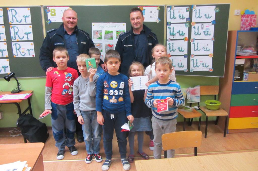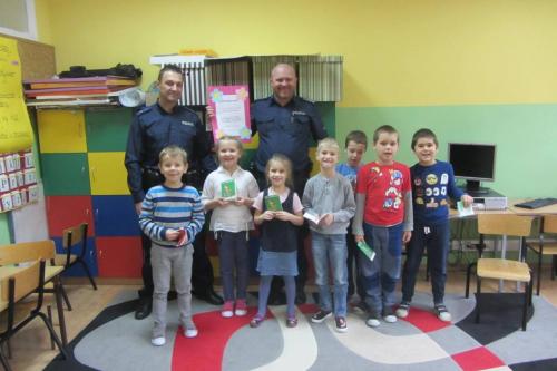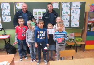Pierwszoklasiści mieli okazję porozmawiać z policjantami o zachowaniu bezpieczeństwa w drodze do i ze szkoły, na temat bezpiecznego przechodzenia przez ulicę, prawidłowego zachowania się podczas jazdy rowerem. Policjanci zwrócili uczniom uwagę na zapinanie pasów  podczas podróży samochodem. Ponadto podkreślili, jak ważną rolę pełnią elementy odblaskowe, które każdy uczeń powinien nosić. Pierwszoklasiści z dużym zainteresowaniem słuchali rad i wskazówek zaproszonych gości i chętnie odpowiadali na zadawane pytania. Wykazali się wiedzą z zakresu bezpieczeństwa w ruchu drogowym i podawali liczne przykłady niewłaściwego zachowania się.  Każdy z uczniów otrzymał na pamiątkę Kodeks drogowy. Na zakończenie wizyty uczniowie wręczyli policjantom podziękowanie.