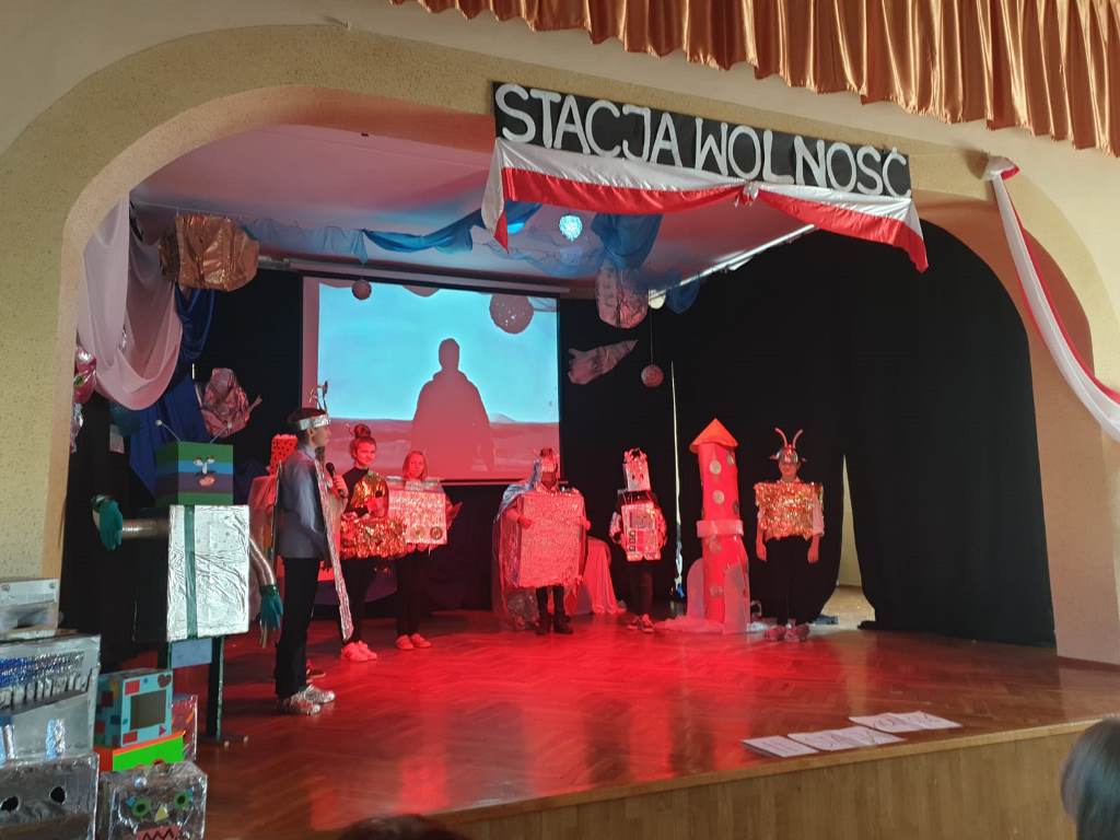 W dniu 8 listopada uczniowie ZS w Wilamowicach obejrzeli program artystyczny przygotowany przez nauczycieli i uczniów z okazji Narodowego Świeta Niepodległości pt.: "Stacja Wolność”.