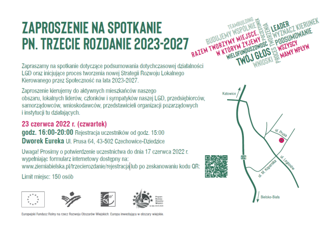 Stowarzyszenie Lokalna Grupa Działania Ziemia Bielska zaprasza na spotkanie inicjujące tworzenie wspomnianego dokumentu na lata 2023-2027. Spotkanie pn. Trzecie rozdanie 2023-2027 odbędzie się 23 czerwca 2022 r. w godzinach 16:00-20:00 (rejestracja od godz. 15:00) w Dworku Eureka w Czechowicach-Dziedzicach.