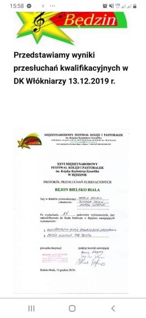 13 grudnia Folklorystyczny Zespół Śpiewaczy "ECHO" z Hecznarowic wziął udział w eliminacjach do Międzynarodowego Festiwalu Kolęd i Pastorałek im. Ks. Kazimierza Szwarlika w Będzinie. Przegląd odbył się w Miejskim Domu Kultury w Bielsku-Białej i wzięło w nim udział 15 podmiotów artystycznych. Werdyktem jury zespół zakwalifikował się do II etapu, który odbędzie się w dniach 9-11 stycznia 2020 r. w Będzinie. Gratulujemy sukcesu i życzymy powodzenia w kolejnym etapie!