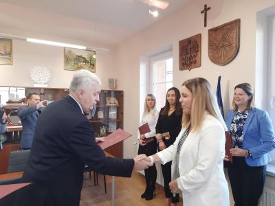 Po odebraniu od nauczycieli ślubowania, Burmistrz Wilamowic wręczył nauczycielom akty nadania stopnia nauczyciela mianowanego oraz listy gratulacyjne.