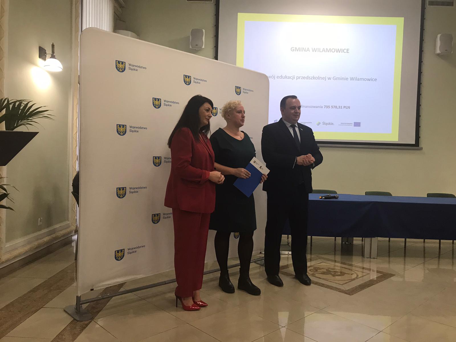 W dniu 3 marca 2020 r. podczas uroczystości w Sali Kolumnowej Urzędu Marszałkowskiego w Katowicach odbyło się wręczenie umowy dotyczącej realizacji projektu ,,Rozwój edukacji przedszkolnej w Gminie Wilamowice”. Z rąk Pana Jakuba Chełstowskiego – Marszałka Województwa Śląskiego oraz Pani Izabeli Domogały – Członkini Zarządu Województwa Śląskiego w imieniu Pana Mariana Treli Burmistrza Wilamowic umowę odebrała Pani Edyta Chrobak – księgowa projektu.