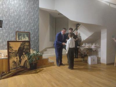 Podczas uroczystości towarzyszyły nam dwie wystawy. Dzięki uprzejmości pani dyrektor Marioli Dylewskiej - Mitoraj z Zespołu Szkół mogliśmy zobaczyć prace, które nagrodzone zostały w Gminnym Konkursie Plastycznym, zorganizowanym pod patronatem Burmistrza Wilamowic, poświęconym naszemu świętemu. Druga wystawa zawierała osobiste rzeczy Świętego, zdjęcia i książki, które udostępnił Ks. Eugeniusz Nycz.
