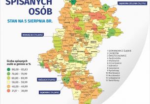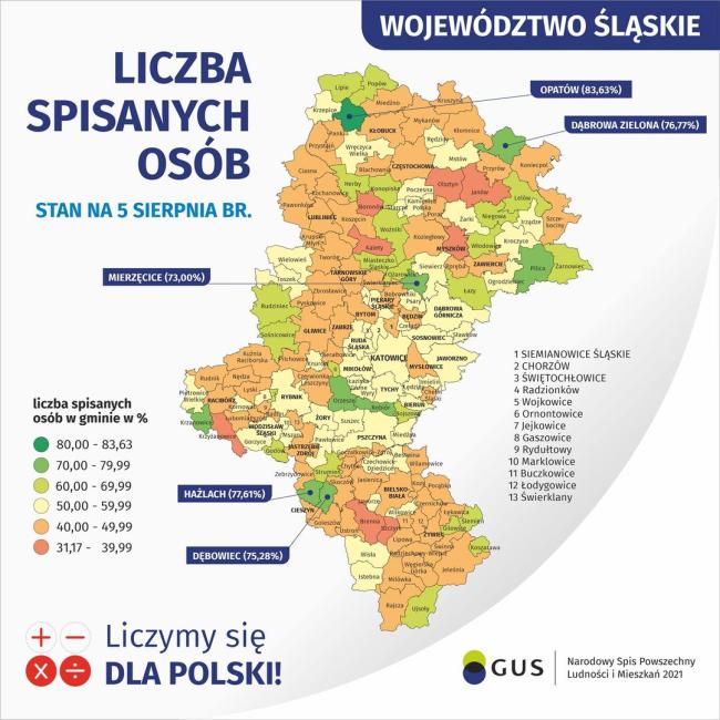 Na dzisiaj (5 sierpnia) w #śląskie w spisie powszechnym wzięło udział 50,16% mieszkańców (9 miejsce wśród województw). Największym odsetkiem spisanych osób może pochwalić się gmina Opatów (83,63%).