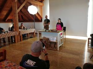 Cała grupa uczestniczyła w dwudniowych warsztatach sztuki robienia kiełbas. Wykładowca-instruktor wędliniarstwa Adam Pulkowski pokazywał, uczył jak robi się m.in. kiełbasę śląską - domowa parzona w jelicie cienkim wieprzowym, kiełbasę jałowcową - w jelicie cienkim wołowym „wiankowym”, wędzoną, pieczoną i podsuszaną, kiełbasę słoikową- farsz zamknięty w słoiku, tyndalizowana i kiełbasę szynkową drobiową - delikatna kiełbasa szynkowa w osłonce sztucznej poliamidowej, parzona. Zgłębialiśmy wiedzę na temat klasyfikacji surowców, peklowania, rozdrabniania, nadziewania, wędzenia, obróbki termicznej (parzenie, podpiekanie, studzenie) oraz podsuszania kiełbas.