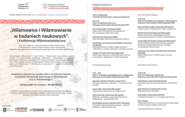 Stowarzyszenie „Wilamowianie” i Urząd Gminy w Wilamowicach mają zaszczyt zaprosić Państwa na międzynarodową konferencję „Wilamowice i Wilamowianie w badaniach naukowych”. Wystąpią na niej naukowczynie i naukowcy (również z uczelni pozaeuropejskich), którzy robili badania terenowe w Wilamowicach. Referaty będą dotyczyć szeroko pojętych badań nad Wilamowicami i Wilamowianami (nazywanych w ostatnich latach również „wilamowianistyką”).