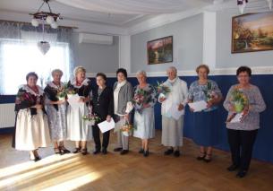 Następnie wrócono myślami wypełnionymi historią do współczesności. Wrócono na salę. Na spotkaniu było bardzo wiosennie nie tylko od dekoracji, ale od atmosfery panującej na Sali. Były wiązanki kwiatów złożone na ręce pani przewodniczącej, słodkości dla pań od naszego sympatyka Koła pana Adama Fabia, słodkości od jubilatek i śpiewu 100-tu lat dla dziewięć koleżanek, które to obchodziły swoje urodziny. W tym roku wszystkie Jubilatki otrzymały bukiety kwiatów wykonane z nylonowych rajstop przez członkinię Koła p. Marię Carbol. Oczywiście był też występ zespołu „Pisarzowianki” i pyszny posiłek przygotowany przez gospodarzy państwo Ilonę i Stanisława Pudełko.