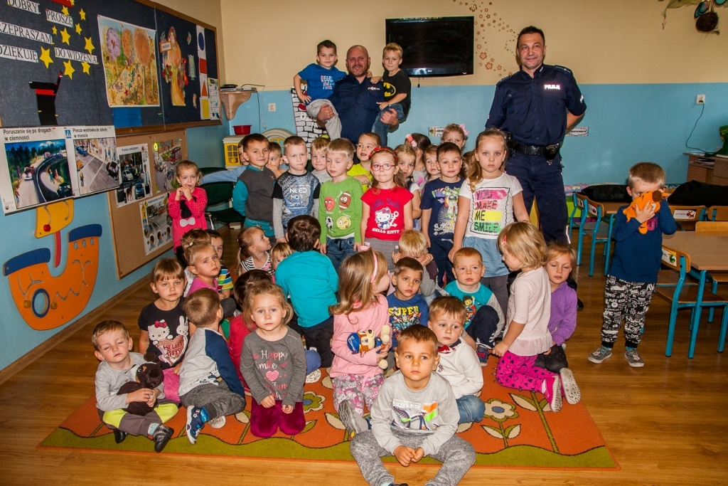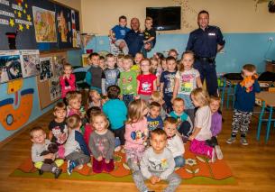 Panowie policjanci zwrócili szczególną uwagę na bezpieczeństwo dzieci w trakcie ich przewożenia samochodem, a jednocześnie przestrzegli przed konsekwencjami braku stosowania przepisów. W starszej grupie przedszkolnej jedno z dzieci przyznało, iż nie korzysta z fotelika. Na pytanie pana policjanta: Dlaczego?- odpowiedziało, że korzysta z przejazdów autobusem szkolnym.