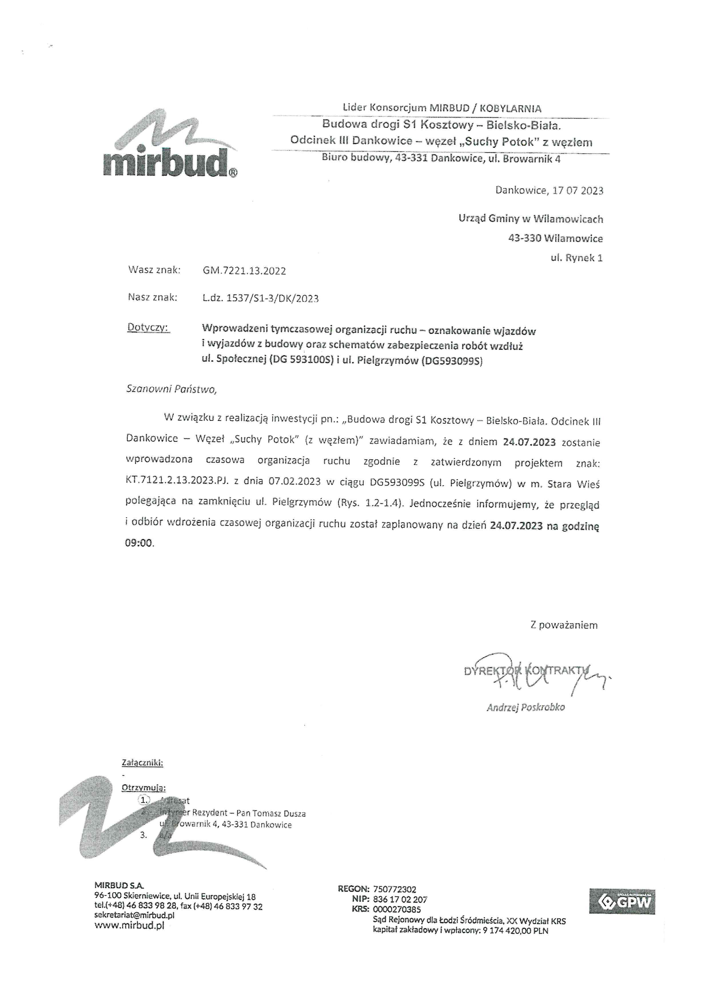 Wprowadzenie tymczasowej organizacji ruchu - ul. Pielgrzymów Stara Wieś