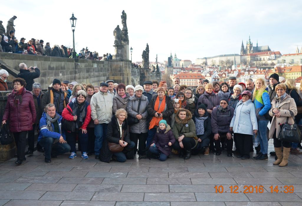 Z Placu Hradczańskiego podziwialiśmy piękną panoramę Małej Strany - Mniejsze Miasto, gdzie cała nasza grupa kierowała się, by dotrzeć do Kampy położonej nad brzegami Wełtawy i przejść po najbardziej zadeptywanym przez turystów zabytkiem na świecie - Moście Karola. Wstąpiliśmy jeszcze do Kościoła Maryi Panny Zwycięskiej i św. Antoniego Padewskiego, by pokłonić się i pomodlić przed Praskim Dzieciątkiem Jezus. Po przejściu w wielkim ścisku przez Most Karola, skierowaliśmy się w kierunku Starego Miasta, gdzie co weekend końcem listopada do Świąt Bożego Narodzenia odbywają się Targi Bożonarodzeniowe. Na Rynku Starego Miasta uwagę naszą przyciągnął Ratusz z przepięknym zegarem astronomicznym z ruchomymi rzeźbami apostołów, postacią Chciwca, Śmierci, Turka. Tutaj też czekały na turystów stragany z ozdobami świątecznym jak i z rodzimym, czeskim jadłem. Pełni wrażeń jak i trochę zmęczeni skierowaliśmy się na Nowe Miasto na kolejny rozświetlony tysiącem światełek Plac Wacława , gdzie nieopodal Muzeum Narodowego czekał na nas autobus.