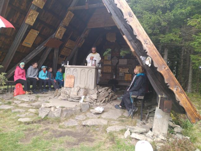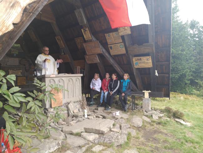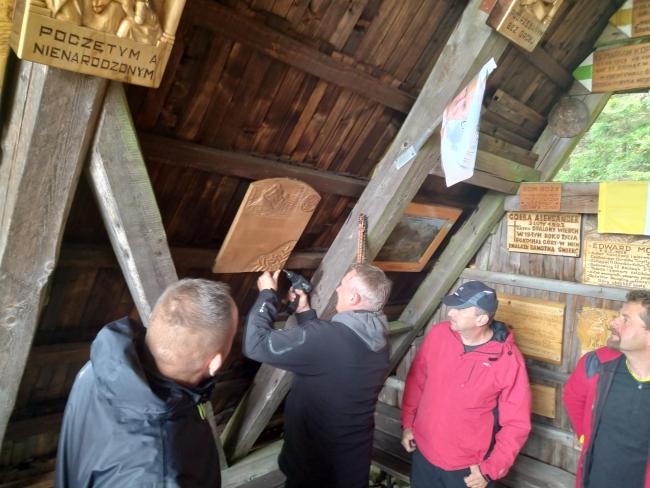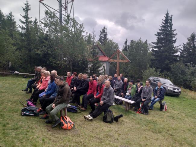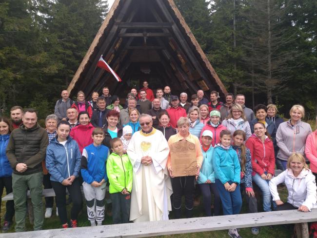 Z parkingu wyruszyliśmy pieszo, niebieskim szlakiem na naszą wędrówkę. Ścieżka miejscami była stroma i kamienista, po której dodatkowo spływają leśne strumyki. Na szczęście strome odcinki poprzerywane były spokojniejszymi odcinkami, na których można było chwilę odetchnąć. Po połączeniu z żółtym szlakiem między drzewami migały nam piękne widoki – warto było przystanąć choćby na chwilę. Po prawie 2 godzinach dotarliśmy na Przełęcz Kucałową, z kąd po 10 minutach dotarliśmy do Kaplicy Matki Bożej Opiekunki Turystów pod szczytem Okrąglicy. Tutaj ksiądz proboszcz Janusz Gacek odprawił mszę świętą za duszę naszego przyjaciela śp. Bogdana Pudełko. Po mszy została poświęcona i zamontowana w Kaplicy tablica upamiętniająca naszego przewodnika. Tablicę pamiątkową ufundował i własnoręcznie wykonał nasz wspaniały artysta Leszek Honkisz, za co mu serdecznie dziękujemy.