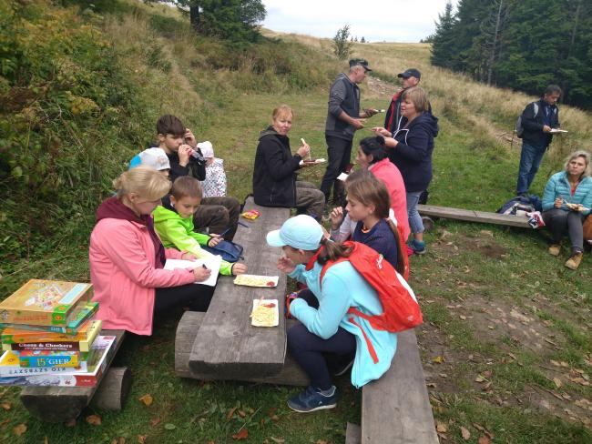 Następnie udaliśmy się do schroniska PTTK im. Kazimierza Sosnowskiego na Hali Krupowej, gdzie odbył się zasłużony odpoczynek, ognisko z pieczeniem kiełbasek i pełne humoru rozmowy. Dla dzieci zorganizowany został konkurs wiedzy o św. Janie Pawle II . Każde dziecko otrzymało pamiątkową nagrodę .