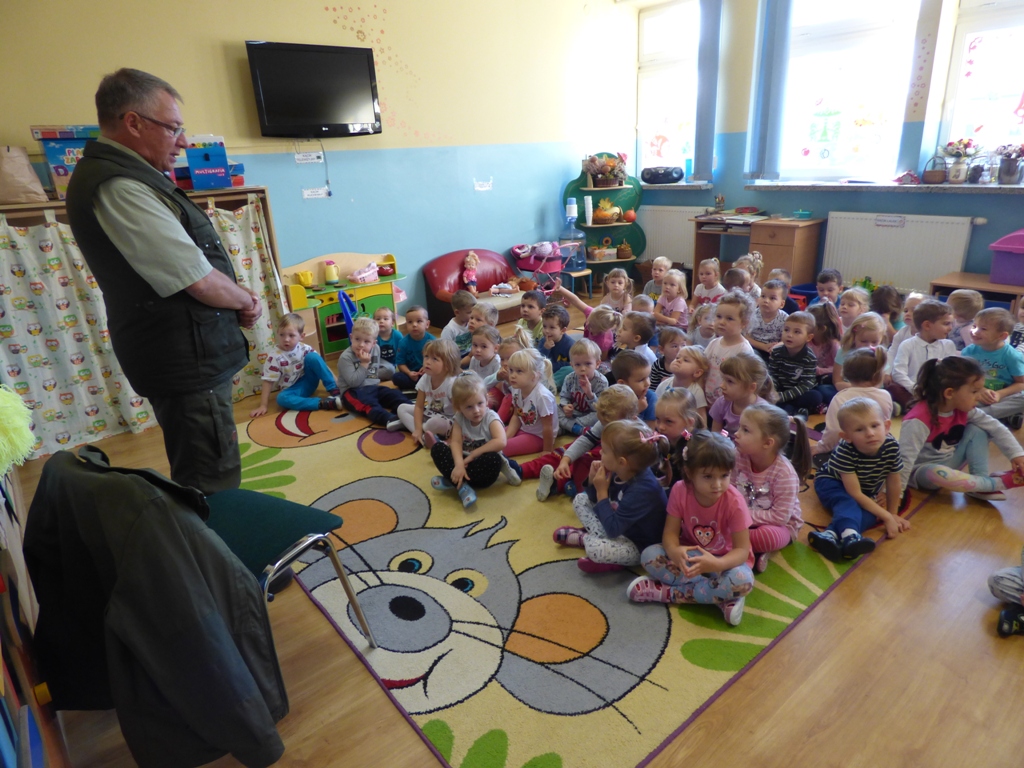 Pan leśnik wyjaśnił dzieciom na czym polega jego praca. Nadzoruje on życie lasu, zarówno zwierząt i roślinności. Opowiedział o etapach wzrostu drzewa począwszy od małego nasionka. Gość zobrazował zwierzęta żyjące w lesie demonstrując przedszkolakom barwne ilustracje m.in. wilka, sarny, zająca, niedźwiedzia, jelenia, jeża, dzika, bobra. Ciekawostką były zagadki słuchowe w postaci okazów pluszowych ptaków: dzięcioła, sowy, wróbla, drozda i innych. Dzieci dowiedziały się o sposobach dożywiania ptaków w okresie zimowym oraz odpowiedniego zachowania podczas pobytu w lesie.