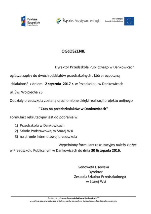Zapisy do dwóch oddziałów przedszkolnych w Przedszkolu w Dankowicach