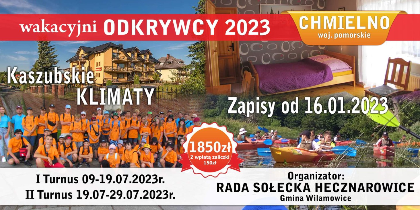 Rada Sołecka Hecznarowic zaprasza dzieci i młodzież w wieku 10–18 lat na kolonie letnie. W 2023 roku będziemy wypoczywać w Chmielnie na Kaszubach. Czeka na Was wiele atrakcji, m.in. spływy kajakowe, rejs statkiem, zwiedzanie Kartuz, Łeby i Gdańska, warsztaty lepienia garnków, czyli „Kaszubskie klimaty”.