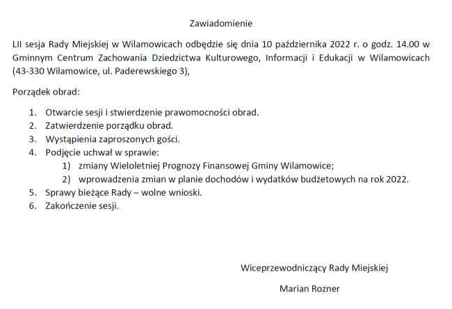 Zawiadomienie LII sesja Rady Miejskiej w Wilamowicach